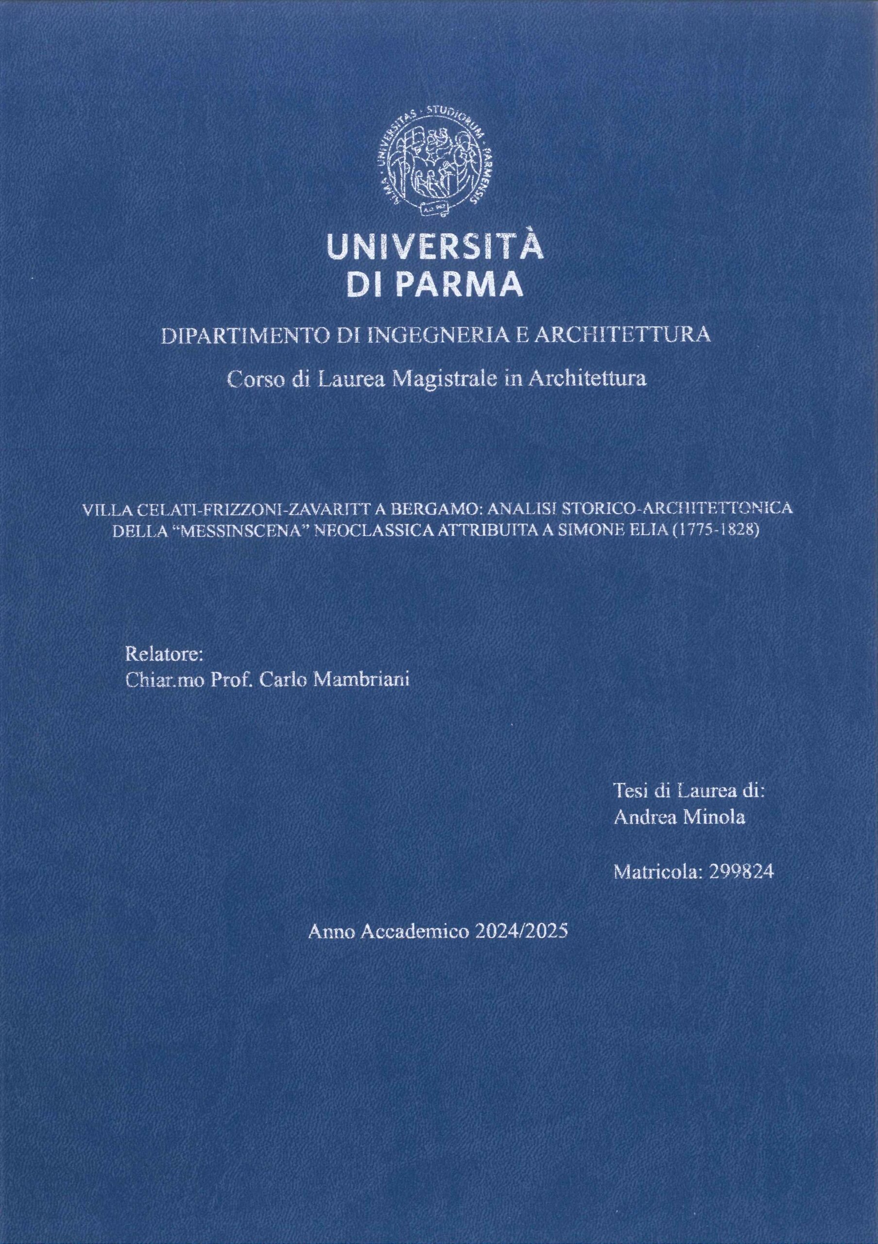 Andrea Minola, nato a Bergamo nel 1979, dopo la maturità tecnica conseguita presso l’Istituto per geometri Giacomo Quarenghi, si è diviso tra studio e lavoro laureandosi nel 2006 in Architettura Ambientale e conseguendo nel 2017 la laurea magistrale in Architettura del Paesaggio. Nel 2025 ha conseguito presso l’Università di Parma, la seconda laurea magistrale in Architettura, con una tesi dal titolo “Villa Celati-Frizzoni-Zavaritt a Bergamo: analisi storico-architettonica della “messinscena” neoclassica attribuita a Simone Elia (1775-1828)” (relatore Chiar.mo Prof. Carlo Mambriani).